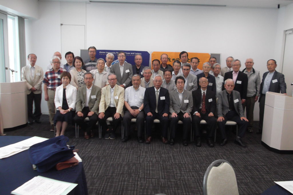 まず岡本会長が「ご来賓の方々はじめ、多数の支部会員の皆様のご参加にお礼申し上げます。昨年は台風の影響で交通網が寸断し、欠席を余儀なくされた方々に申し訳なく、愛媛県では水害による甚大な被害があり、1日も早い完全復興をお祈りいたします。また昨年は法文学部創立50周年記念式典が盛大に開催され、私も出席し素晴らしい節目になったと感激しました。同窓会では今秋に卒業生名簿が完成するとのことで、同窓会活動に大きな力と期待いたします」と挨拶しました。