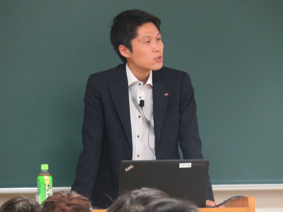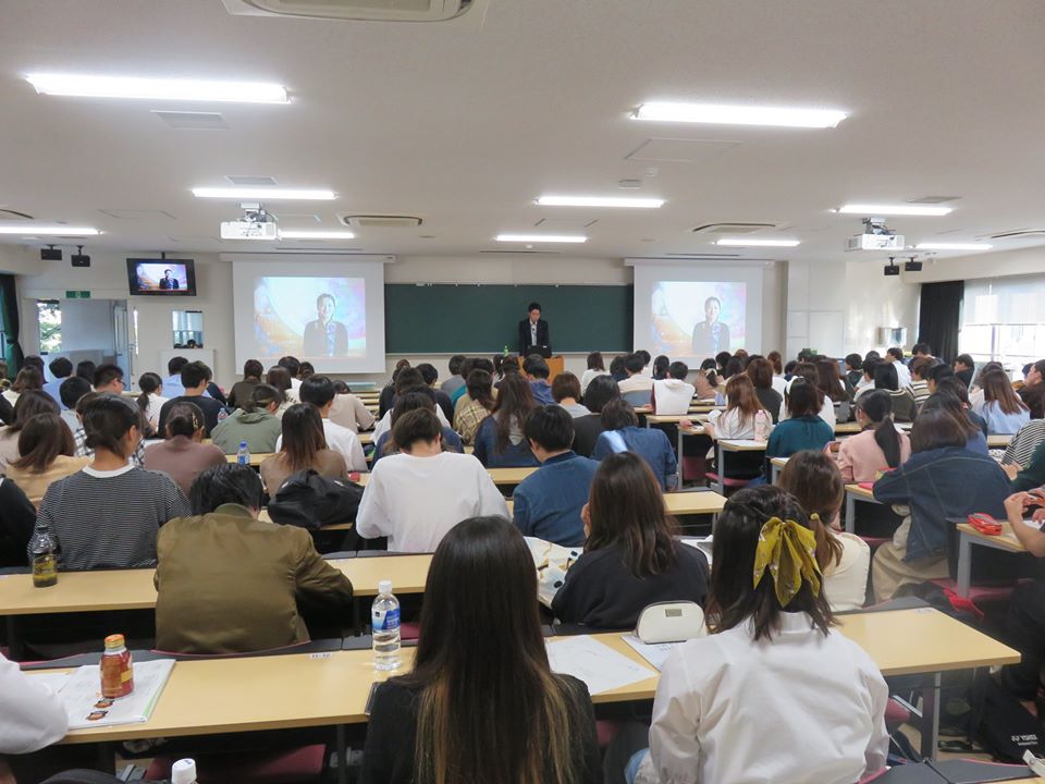 「ホテル業界で働く」というタイトルで、講師は人文学科を平成18年にご卒業の森下由一さんでした。ANAクラウンプラザホテル松山の総務支配人でいらっしゃいます。
