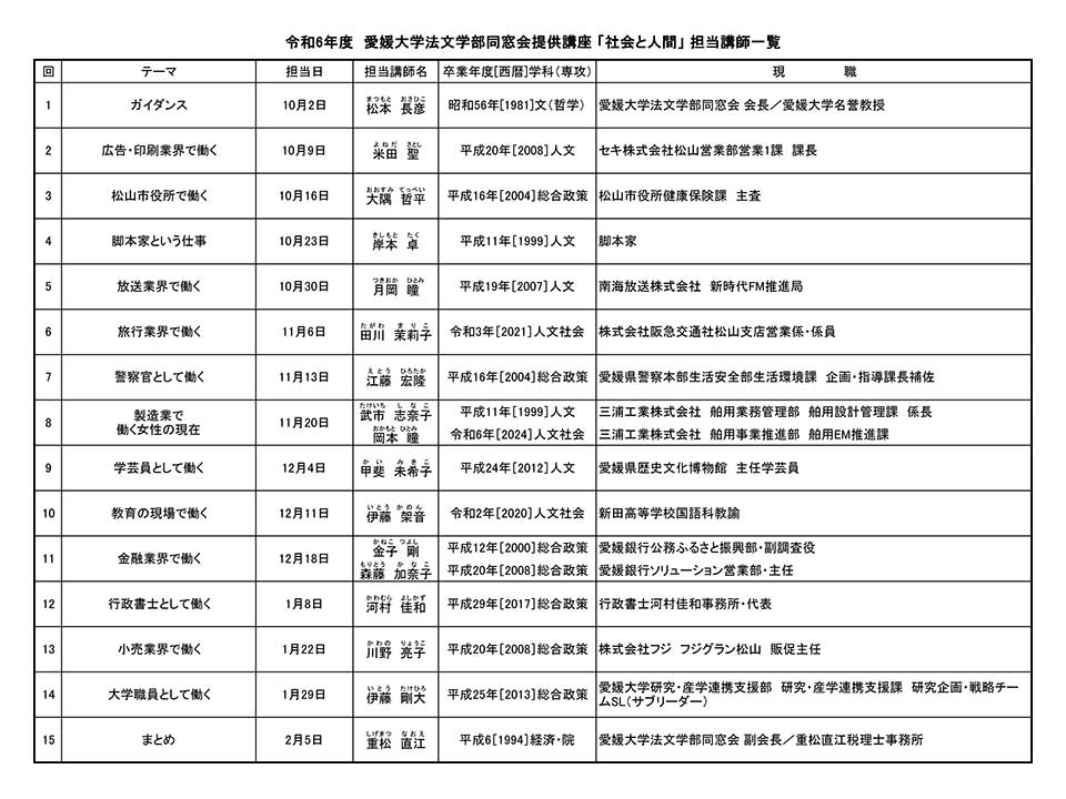 2024年(令和6年)度 同窓会提供講座 2025年9月6日 最終更新日時 : 2025年9月6日 同窓会事務局 法文学部同窓会提供講座『社会と人間』 令和6度に開催される提供講座のスケジュールが決定しました。 令和6年度愛媛大学法文学部同窓会提供講座「社会と人間」担当講師一覧PDFダウンロード