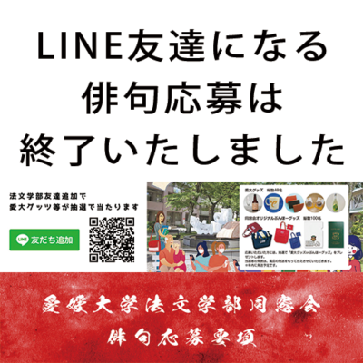 LINE友達を追加、俳句応募は11月末で終了しました。 法文学部法文学部同窓会LINEとお友達になっていただきありがとうございます。「LINE友達になる」プレゼント応募企画を実施します。法文学部法文学部同窓 […]