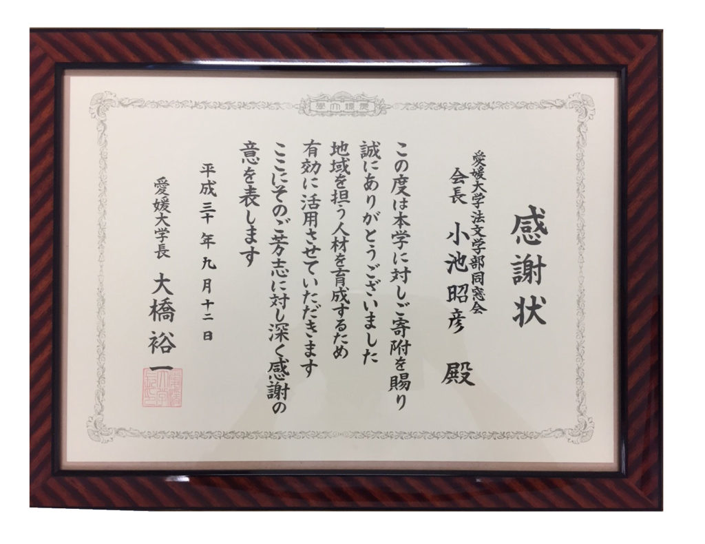 法文学部同窓会から法文学部(愛大基金)への寄付に対して、感謝状が授与されました 2018年10月1日 最終更新日時 : 2018年10月9日 同窓会事務局 「法文学部同窓会から法文学部(愛大基金)への寄付に対して、感謝状が授与されました。主に、法文学部生の海外留学などに使われる予定です。」