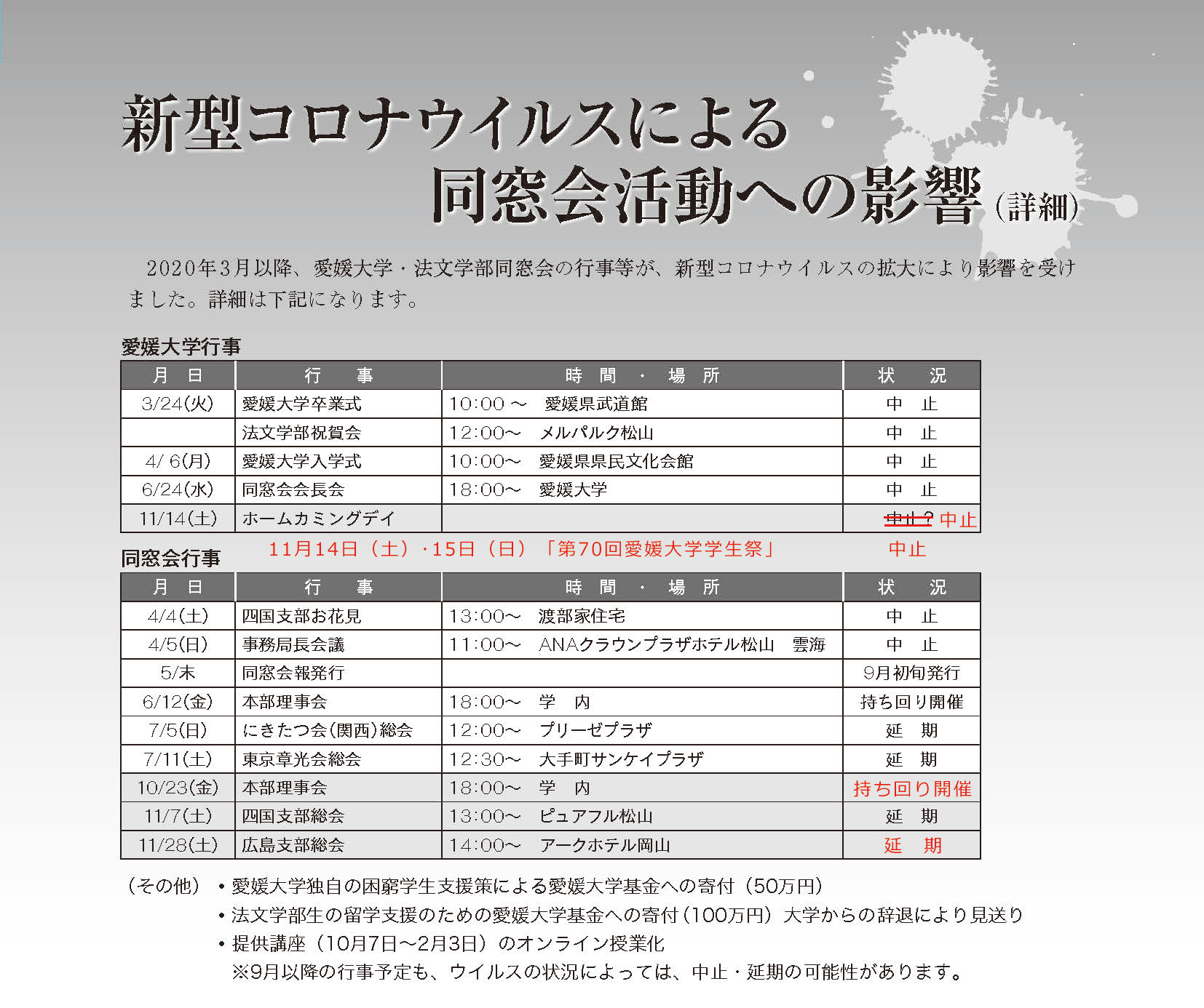 本部理事会持ち回り開催、四国支部総会並びに広島支部総会延期となりました 2020年9月26日 最終更新日時 : 2020年9月26日 同窓会事務局 新型コロナウイルス感染拡大防止の観点から、参加する皆様の安全と健康を第一に考えた上で中止となりました。 10月23日(金)本部理事会持ち回り開催 11月7日(土)四国支部総会 延期 11月28日(土)広島支部総会 延期