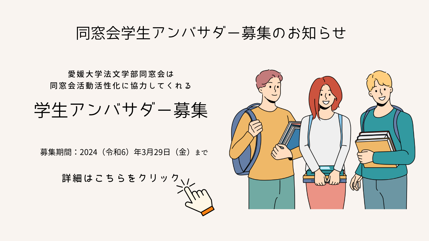 愛媛大学法文学部同窓会は、同窓会活動活性化に協力してくださる「同窓会学生アンバサダー」を募集します。