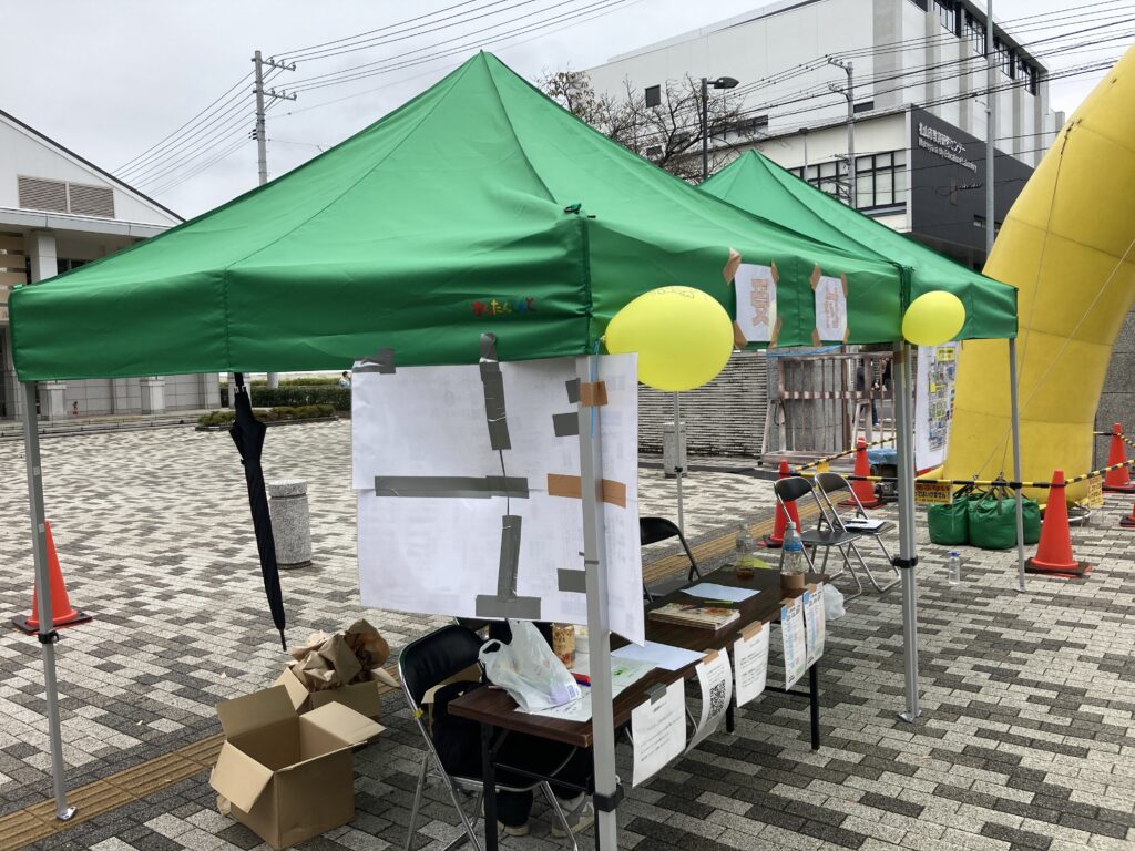 学際実行委員の方々は顔出しNGとのことでしたのでテントのみ。入り口で来場者にパンフレットを配布していました。 その他、会場各所でゴミ分別係としてごみの回収に当たっていたり、学際を支える裏方として頑張っていました。