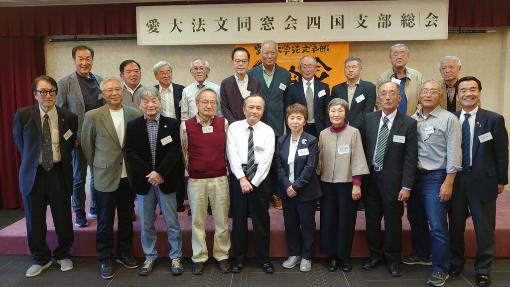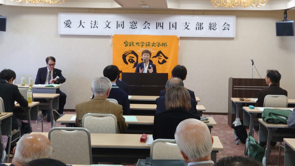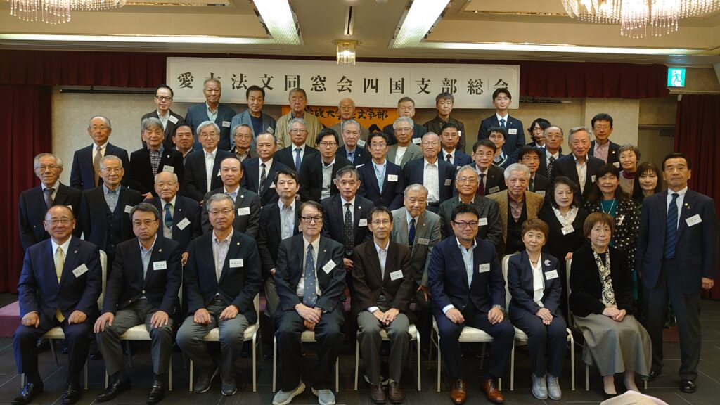 令和7年11月8日(土)13:00から南堀端のリジェール松山にて、支部総会を開催しました。来賓として井口秀作法文学部長、青野治彦事務課長、本部から黒河安徳会長、東京章光会・清水栄治会長、関西にきたつ会・島田光照会長、中国支部・難波宣久支部長にご出席いただきました。玉井周平支部長の挨拶のあと議案が承認されました。